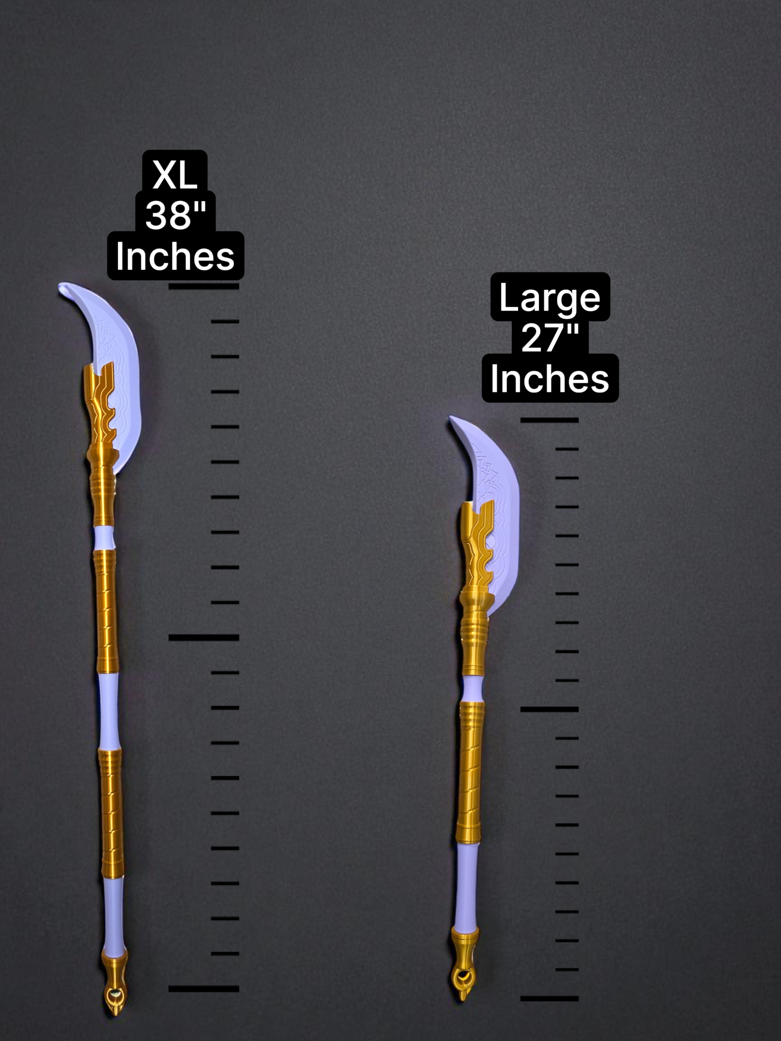 - XL (38 inches): Full-scale display size — perfect for cosplay conventions and costume builds